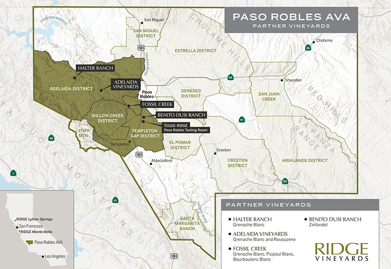 “The 2023 ‘Paso Robles’ Zinfandel is sourced from the Dusi Vineyard, as this wine was first made by Ridge in the 1960s. 100% varietal, this offers graphite and dark chocolate shavings mingle well with cardamom dusted orange peel and menthol notes on the nose. The palate is very fresh and lithe on the mouth, with terrific tension and texture, as well as salty undertones. Complex and delicious, enjoy now and over the next ten years. Drink 2025-2035.” -Owen Bargreen