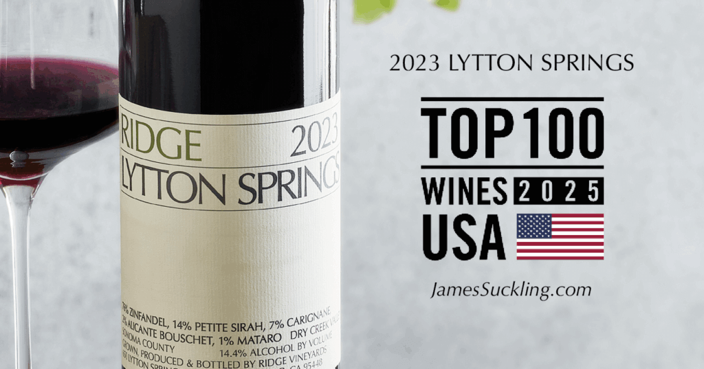 We’re thrilled to announce that JamesSuckling.com has recognized thirteen RIDGE wines from Sonoma and Napa Counties in their latest reviews. A special congratulations goes to our 2023 Lytton Springs, which received 95 points and a spot on the “Top 100 Wines of the USA” list at #71. It’s a true honor for our team and our Lytton Springs estate vineyard.