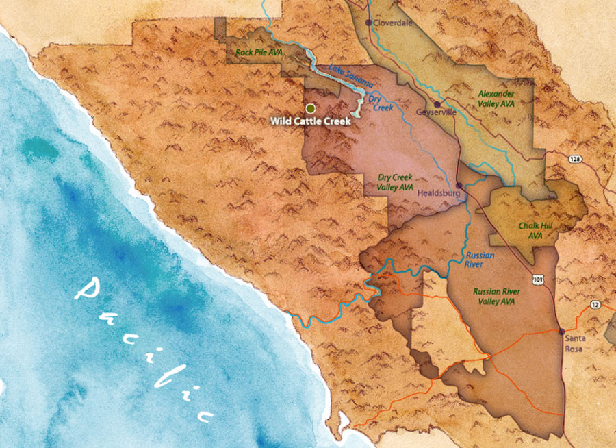 The wine is named after Wild Cattle Creek which runs through the valley below and forms the property border. The creek is the only one in the area that runs year-around. Since the late 1800s, each summer, the local cattle descend from the dry hills to drink from the creek.